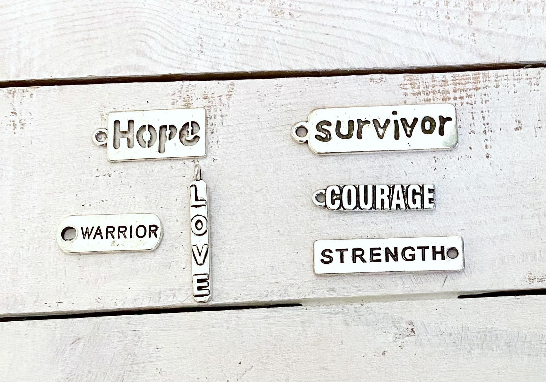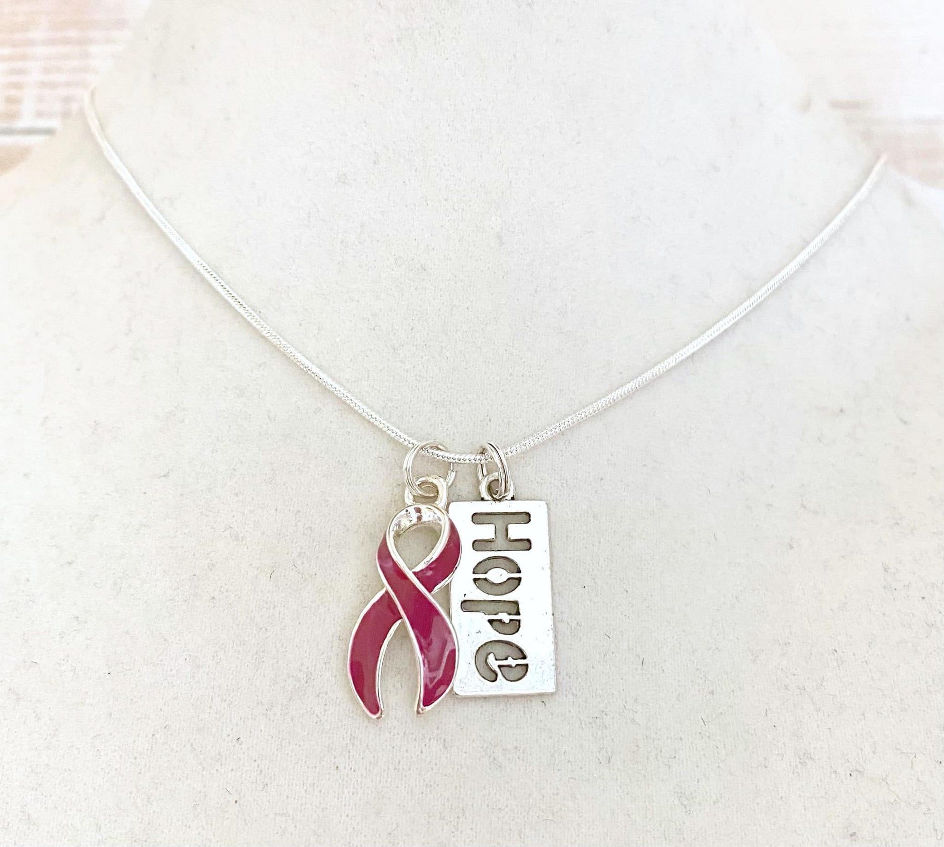 This necklace is great way to show your support and awareness of the following: *Multiple Myeloma Awareness *Adults with Disabilities Awareness *Amyloidosis Awareness *Oral Cancer Awareness *Brain Aneurysm Awareness *Headaches and Migraines Awareness Silver Plated Snake Chain. Please select your necklace length from the menu. Necklace comes with the Burgundy Awareness Ribbon Charm. Charm is silver plated. Charm measures approximately 1 inch in length. Other Charms are extra, and must be selected from the  menu. You select your charm choice (Warrior, Love, Hope, Strength, Survivor, Courage) from the drop-down menu (see photo for sample of all charms). **Please indicate in the Comments Section at checkout which charm(s) you wish to have added to your necklace. Please be sure that the number of charms you select matches the number of charms you request in the Comments Section.** Warrior Charm is Silver Plated, and measures 21mm in length. Love Charm is Silver Plated, and measures 28 x 4mm. Hope Charm is Silver Plated, and measures 23mm x11mm. Charm has the word "HOPE" cut out like a stencil. Courage Charm is Silver Plated, and measures 25mm x 5mm. Survivor Charm is Silver Plated, and measures 10mm x 30mm.