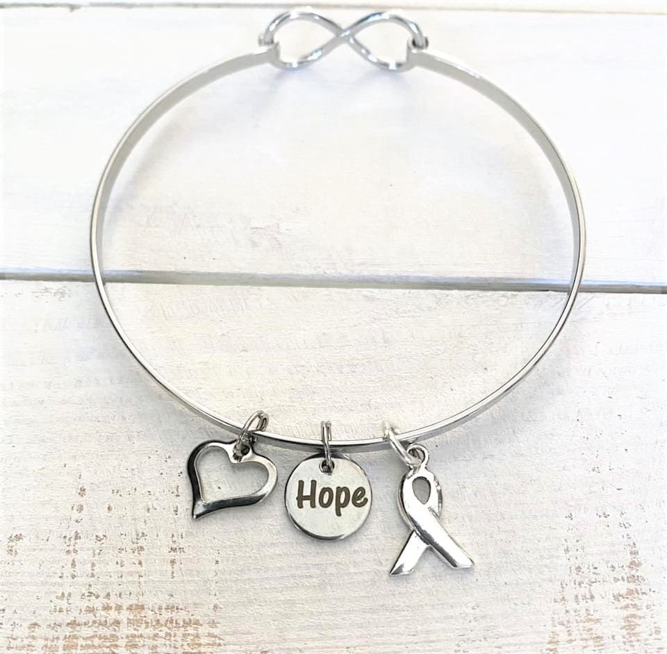 This is a great way for you to show your support and awareness for Melanoma. Stainless Steel Bangle Bracelet has an Infinity Symbol as the bracelet bar. Bracelet opens on the side and is easy to open and close. Bracelet will never tarnish or discolor. Bracelet is made of 3mm flat Stainless Steel wire, The Infinity charm measures just under 1/2 inch x 1 inch (1.27 x 2.54cm) Size of bracelet is 60mm width or 2 1/4 inches around. It will fit most bracelet sizes between 6 1/2 inches and 7 1/2 inches. Black-colored Swarovski Crystal Bicone Charm is Wire-Wrapped by hand with a Sterling Silver Filled Headpin. The crystal charm is wire-wrapped directly onto the infinity bar so it will not come off - it is a very secure connection. You have your choice of adding a charm or charms, which will be attached to the bangle bar (see photos). You may choose a Sterling Silver Awareness Ribbon Charm, and/or a Stainless Steel Laser Engraved "HOPE", "LOVE", or Heart Charm. "Hope" and "Love" charms measure 10mm. Sterling Silver Ribbon Charm measures 13.5mm x 9mm. Heart Charm is Stainless Steel and measures 11mm x 11mm. **Please select your charm choice from the menu.**