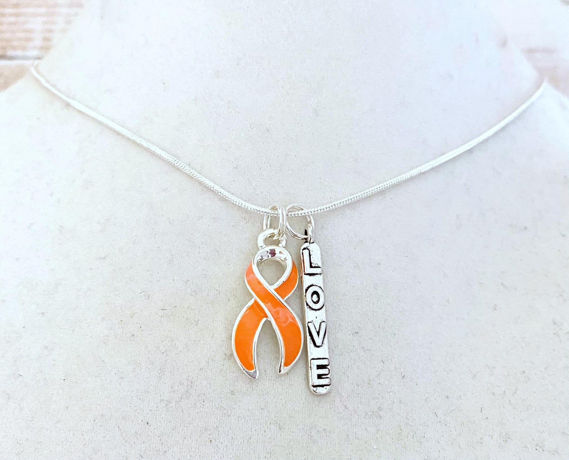 Necklace comes with the Orange Awareness Ribbon Charm. Charm is silver plated. Charm measures approximately 1 inch in length. Other Charms are extra, and must be selected from the drop-down menu.